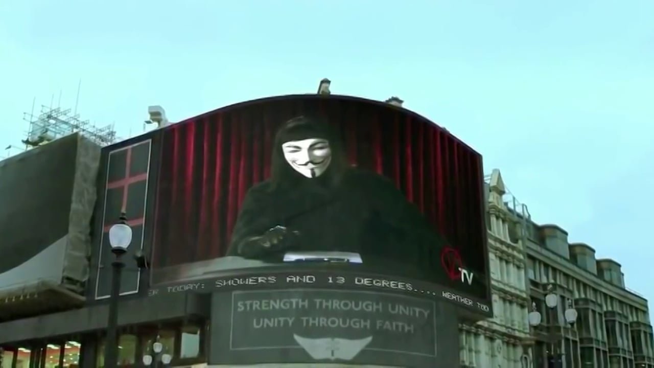 ها هو الرجل المقنّع “V” في فيلم “V for Vendetta” (الذي تدور أحداثه في المستقبل القريب) يحاول استكمال مسيرة “جاي فوكس” وإيقاظ الناس وحثهم على الثورة ضد نظام الحكم الديكتاتوريّ الفاشي بقيادة المستشار “آدم ساتلر” الذي تولى الحكم وَسط الفوضى والخوف بعد الحرب العالمية الثالثة، وحكم البلاد بالحديد والنار، ويعيش في مخبأ سريّ شديد الحراسة تحت الأرض، ويتواصل مع المواطنين ووزرائه ومساعديه من خلال الشاشات فقط.