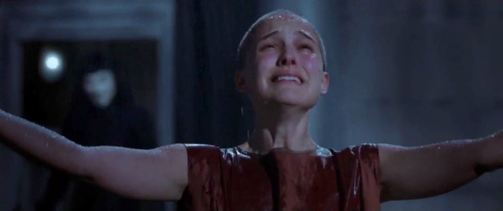 يقوم “V” بتفجير مبنى المحكمة العُليا القديم والذي أصبح رمزًا للظلم والفساد بدلًا من أن يكون صرحًا للعدالة والحق، ينسفه في مشهدٍ خالدٍ على أنغام مقطوعة موسيقيّة عظيمة ل”تشايكوفيسكي”. وسواء عليك أكنت توافق على هذا في الحقيقة أم لا فعليك أن تعترف بالشعور الذي يساورك أحيانًا بالرغبة في نسف تلك المؤسسات الفاسدة الظالمة والبيروقراطية حتى ولو بصورة رمزية للتعبير عن سخطك وحنقك.