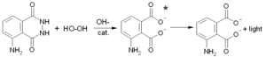 تفاعل الدم (الدم يعمل كمحفز cat.) مع مادة اللومينول فينتج Luminol Hydroperoxide وضوء