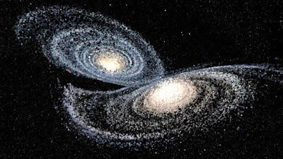 لذا فقوة الجاذبية بين مجرتنا درب التبانة ومجرة أندروميدا تعمل على اقترابهما من بعضهما البعض بسرعة 120 كيلومتر في الثانية، لتصطدم المجرتان ببعضهما البعض بعد 4.5 مليار سنه تقريبًا، لتجتمعا معًا في مجرة إهليجية الشكل أكبر في الحجم من كلتيهما.