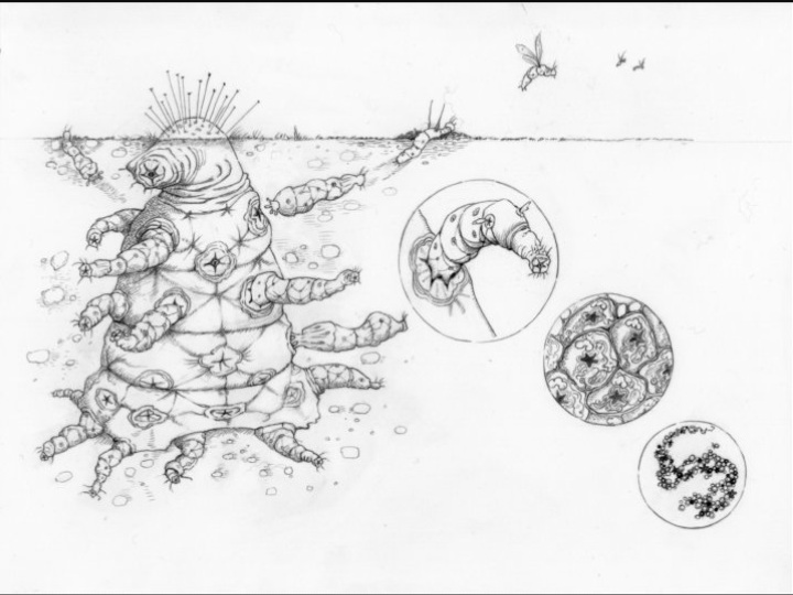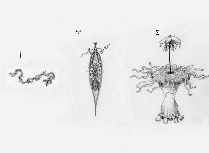 (ج) الشكل النهائي للكائن الفضائي، والذي يمتلك العديد من الأجزاء المعقدة التي تعمل معًا، والتي من المحتمل أن تكون قد خضعت لتغيرات كبيرة كما يحدث على الارض.