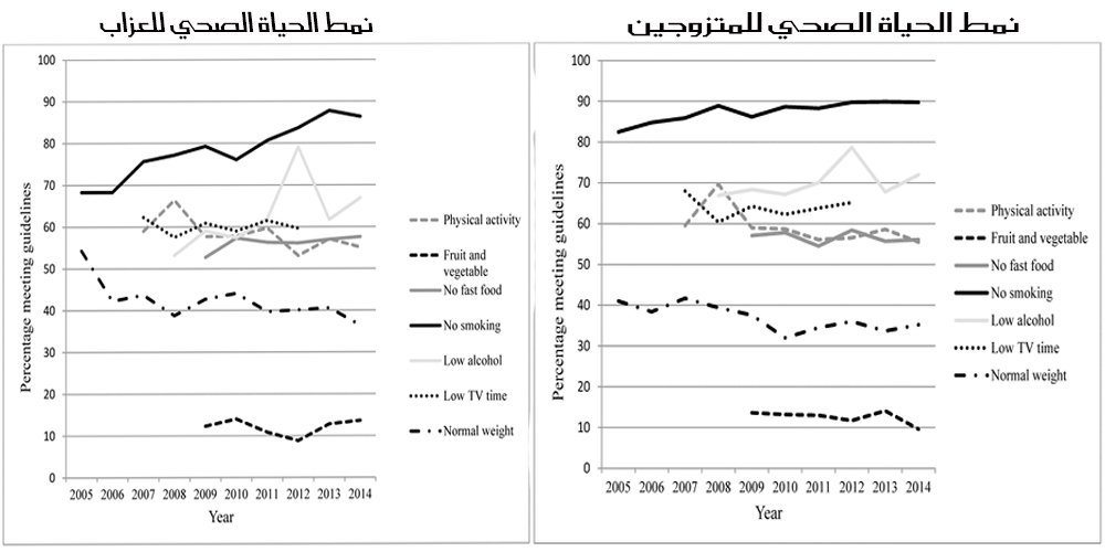 مقارنة وتيرة واتجاهات عوامل نمط الحياة الصحية بين العزاب والأزواج.