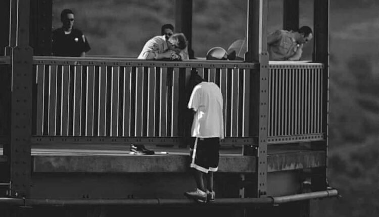 ركنت السيارة ومشيت نحو الجسر. عندما قفزت فوق السور سمعت أحدهم يقول: “مهلًا، انتظر لحظة”. كنت مقتنعًا بأنني سأنهي حياتي، لكن في آخر لحظة صوته جعلني أتوقف وأمسك بالسور. هذا ما ترونه في الصورة – أقف على الحافة. أعرف الآن أن ذلك كان الضابط بريجز (المركز، يميل على السور). لقد أعادني إلى الواقع. كنت على تلك الحافة لمدة ٩٢ دقيقة، و٨٩ منهم تحدثت للتو. أخرجت كل شيء واستمع دون أن يحكم.